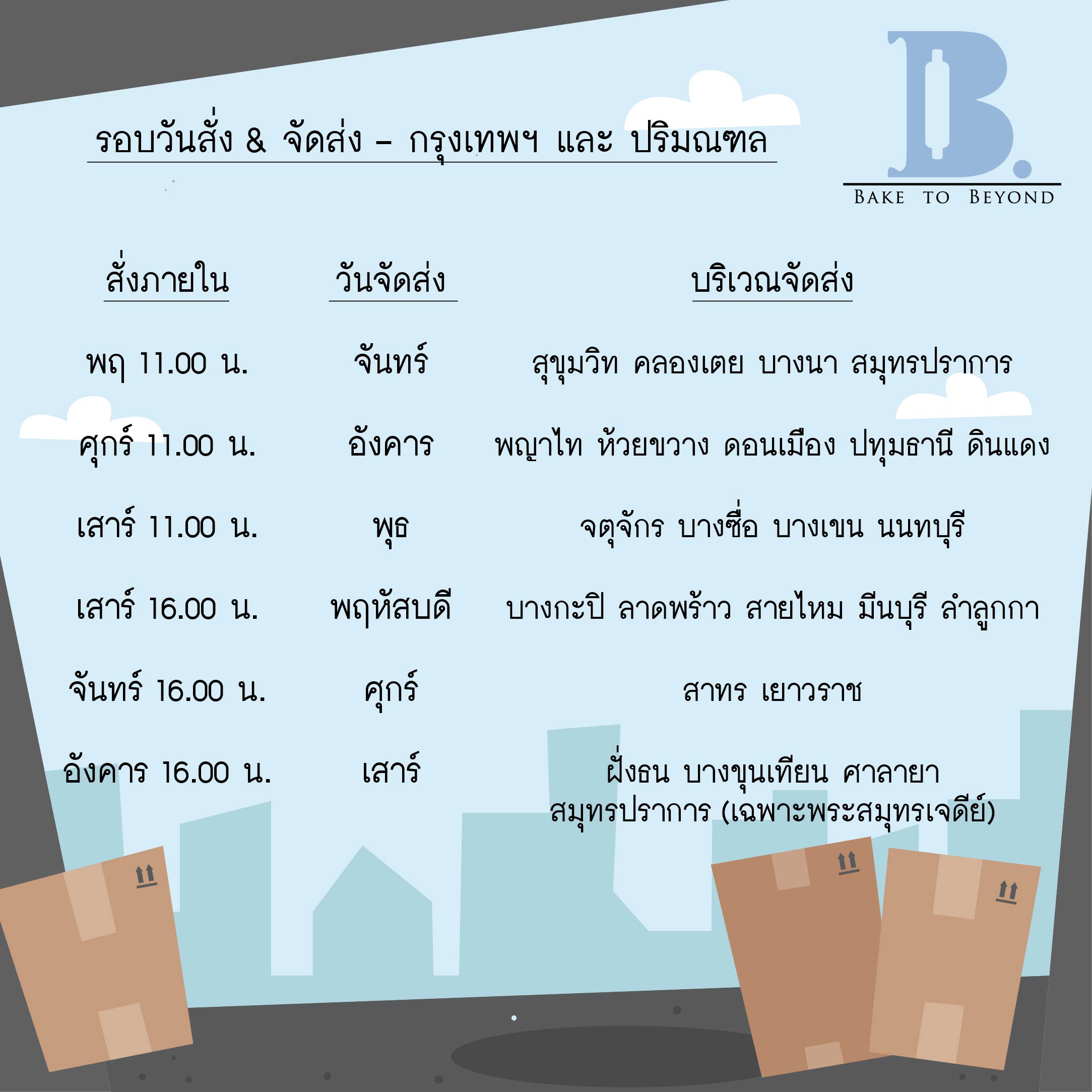 มีบริการจัดส่งตามจังหวัดในตารางรอบการส่งสินค้าคร่าวๆ ด้านล่าง (ตารางแสดงวันที่รถวิ่งออกจากคลังสินค้า